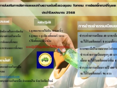 ประชาสัมพันธ์เข้าร่วมโครงการ ส่งเสริมการจัดการขยะและสร้างความเข้มแข็งของชุมชน กิจกรรม: ติดสติ๊กเกอร์ที่ถุงขยะ ประจำปีงบประมาณ 2568