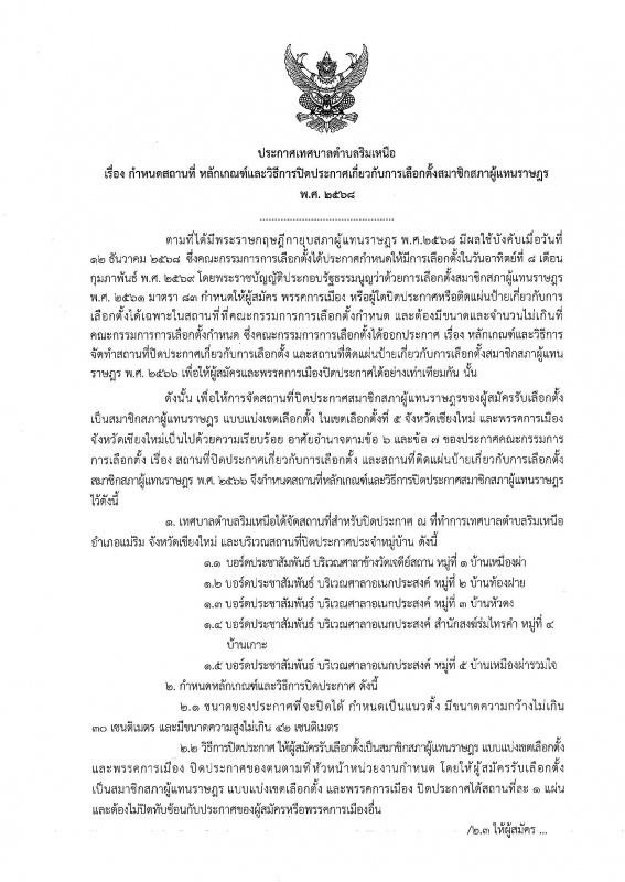 | 1 | ประกาศ กำหนดสถานที่ หลักเกณฑ์และวิธีการปิดประกาศเกี่ยวกับการเลือกตั้งสมาชิกสภาผู้แทนราษฎร พ.ศ. 2568 |