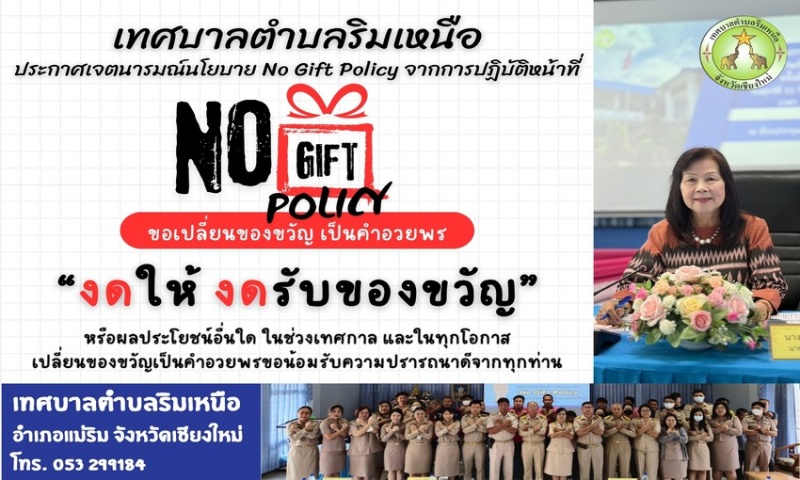 ด้วยวันที่ 10 กุมภาพันธ์ 2569 นางพรรณี ลานนาพันธุ์ นายกเทศมนตรีตำบลริมเหนือ ได้ลงนามประกาศนโยบายไม่รับของขวัญฯ เพื่อประกาศเจตนารมณ์การไม่รับของขวัญและของกำนัลทุกชนิดจากการปฏิบัติหน้าที่ (No Gift Policy) ประจำปีงบประมาณ พ.ศ. 2569 ของเทศบาลตำบลริมเหนือ เพื่อให้ผู้บริหาร ข้าราชการ พนักงาน และเจ้าหน้าที่ในสังกัดถือปฏิบัติตามนโยบายดังกล่าวอย่างเคร่งครัด ประกอบกับให้ศึกษาประกาศคณะกรรมการป้องกันและปราบปรามการทุจริตแห่งชาติ เรื่อง หลักเกณฑ์การรับทรัพย์สินหรือประโยชน์อื่นใดโดยธรรมจรรยาของเจ้าพนักงานของรัฐ พ.ศ. 2563 และประชาสัมพันธ์เพื่อให้ผู้บริหาร ข้าราชการ พนักงาน และเจ้าหน้าที่ พร้อมทั้งให้ประชาชน ได้รับทราบ