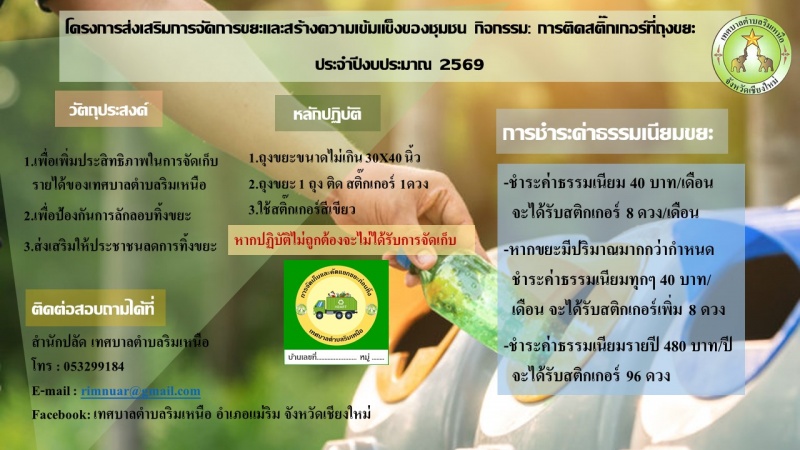 ประชาสัมพันธ์ การเข้าร่วมโครงการส่งเสริมการจัดการขยะและสร้างความเข้มแข็งของชุมชน กิจกรรม การติดสติ๊กเกอร์ที่ถุงขยะ ประจำปีงบประมาณ 2569
