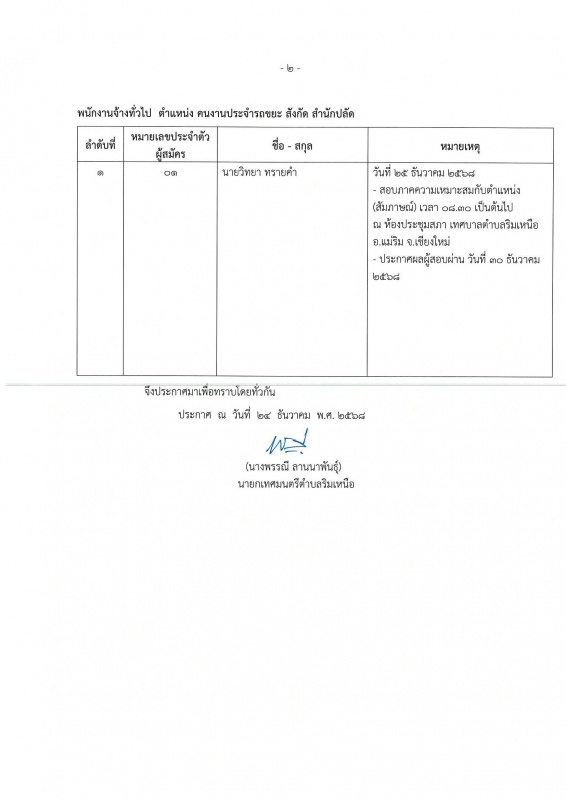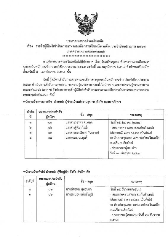 ประกาศเทศบาลตำบลริมเหนือ เรื่อง รายชื่อผู้มีสิทธิเข้ารับการสรรหาและเลือกสรรเป็นพนักงานจ้าง ประจำปีงบประมาณ 2569 ภาคความเหมาะสมกับตำแหน่ง