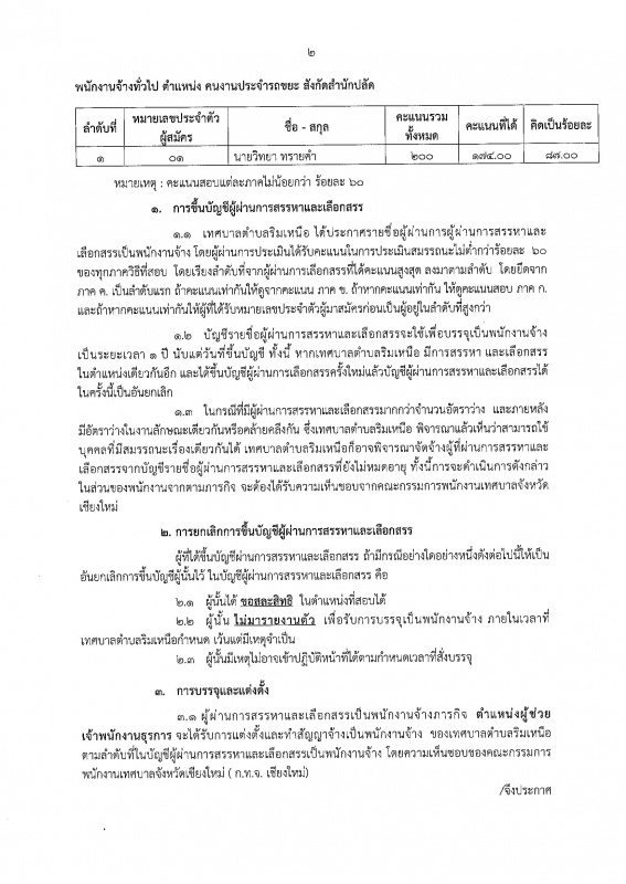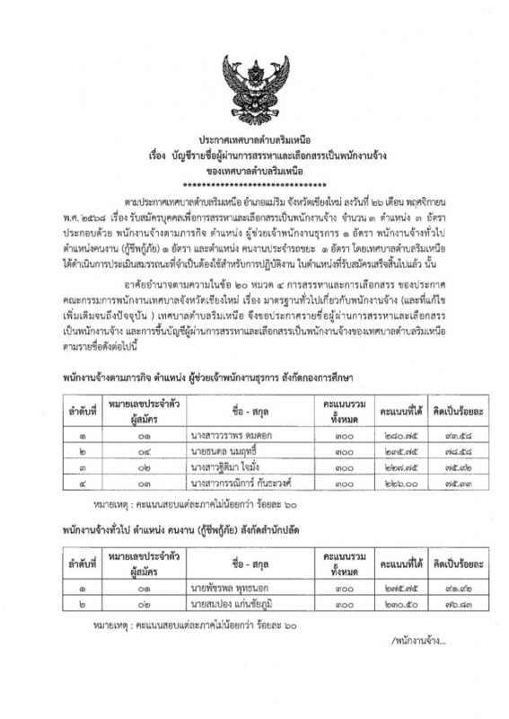 ประกาศเทศบาลตำบลริมเหนือ เรื่อง บัญชีรายชื่อผู้ผ่านการสรรหาและเลือกสรรเป็นพนักงานจ้างของเทศบาลตำบลริมเหนือ