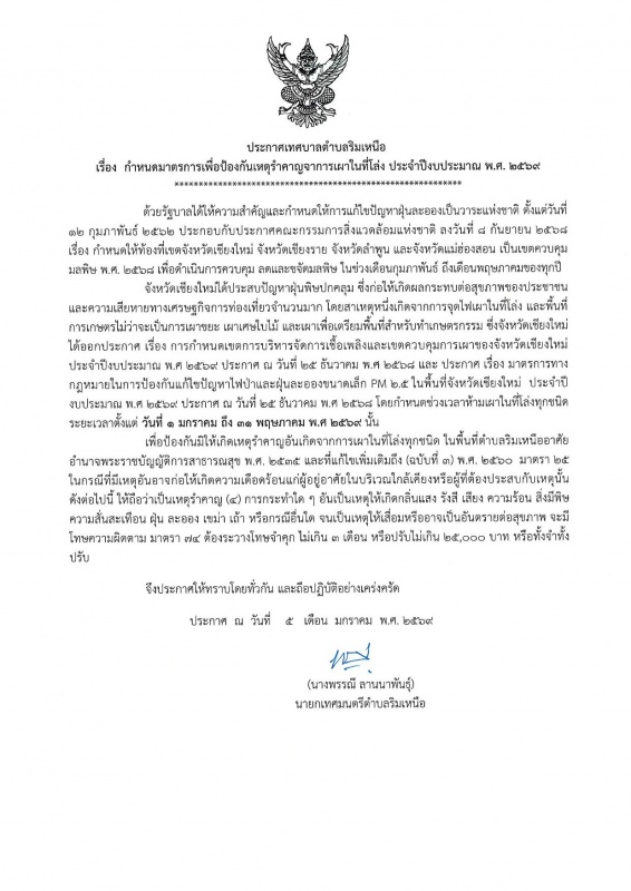ประกาศ เทศบาลตำบลริมเหนือ เรื่อง กำหนดมาตรการเพื่อป้องกันเหตุรำคาญจากการเผาในที่โล่ง ประจำปีงบประมาณ พ.ศ. 2569