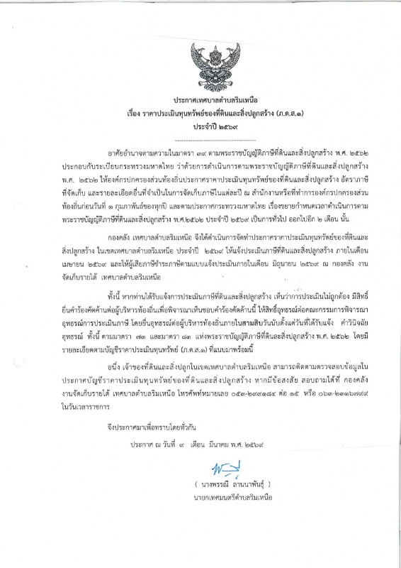 ประกาสเทศบาลตำบลริมเหนือ เรื่อง ราคาประเมินทุนทรัพย์ของที่ดินและสิ่งปลูกสร้าง( ภ.ด.ส.1) ประจำปี 2569